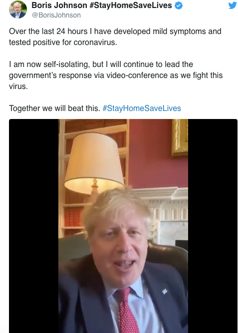 总理鲍里斯·约翰逊(Boris Johnson)他发布了一段视频,承认自己有“轻微症状”,并且正在自我隔离,但是他说,“在我们与这种病毒作斗争时,他将继续通过视频会议领导政府的对策”。