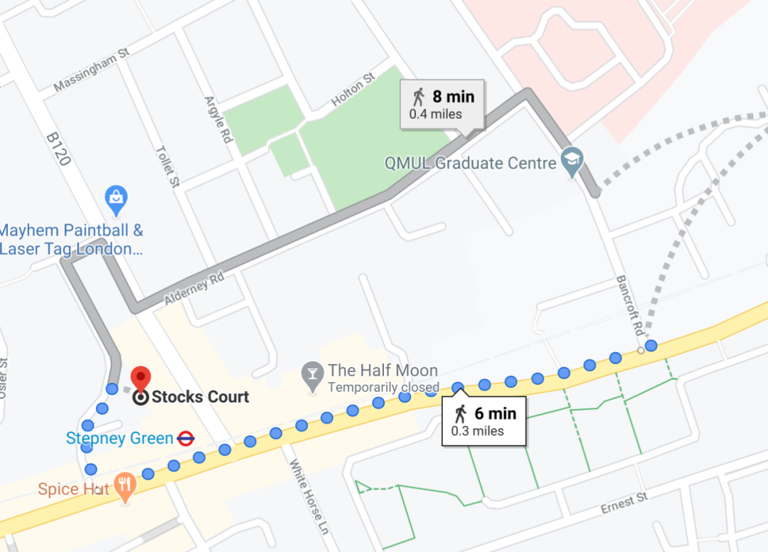 Stocks Court学生公寓临近主校区,方便去学校。紧挨Stepney Green地铁站,站内有District Line,Hammersmith & City Line 以及 Circle Line。房间设施较为老旧。周边没有大型商圈,大超市只有个阿斯达,小超市有Co-op和Sainsbury's,卫生间为3-4人共享。