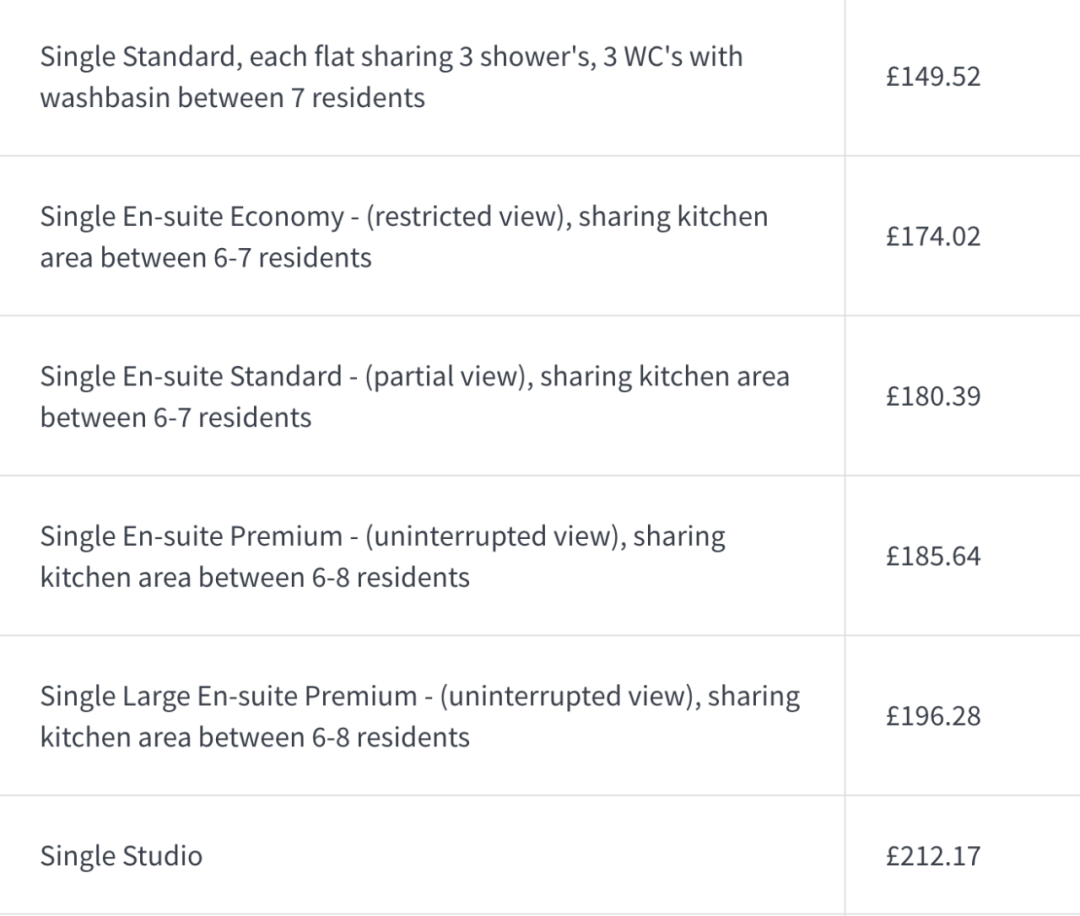 | Single En-suite Economy, Private Shower Room with WC9-11 residents per flat | £164.57 |