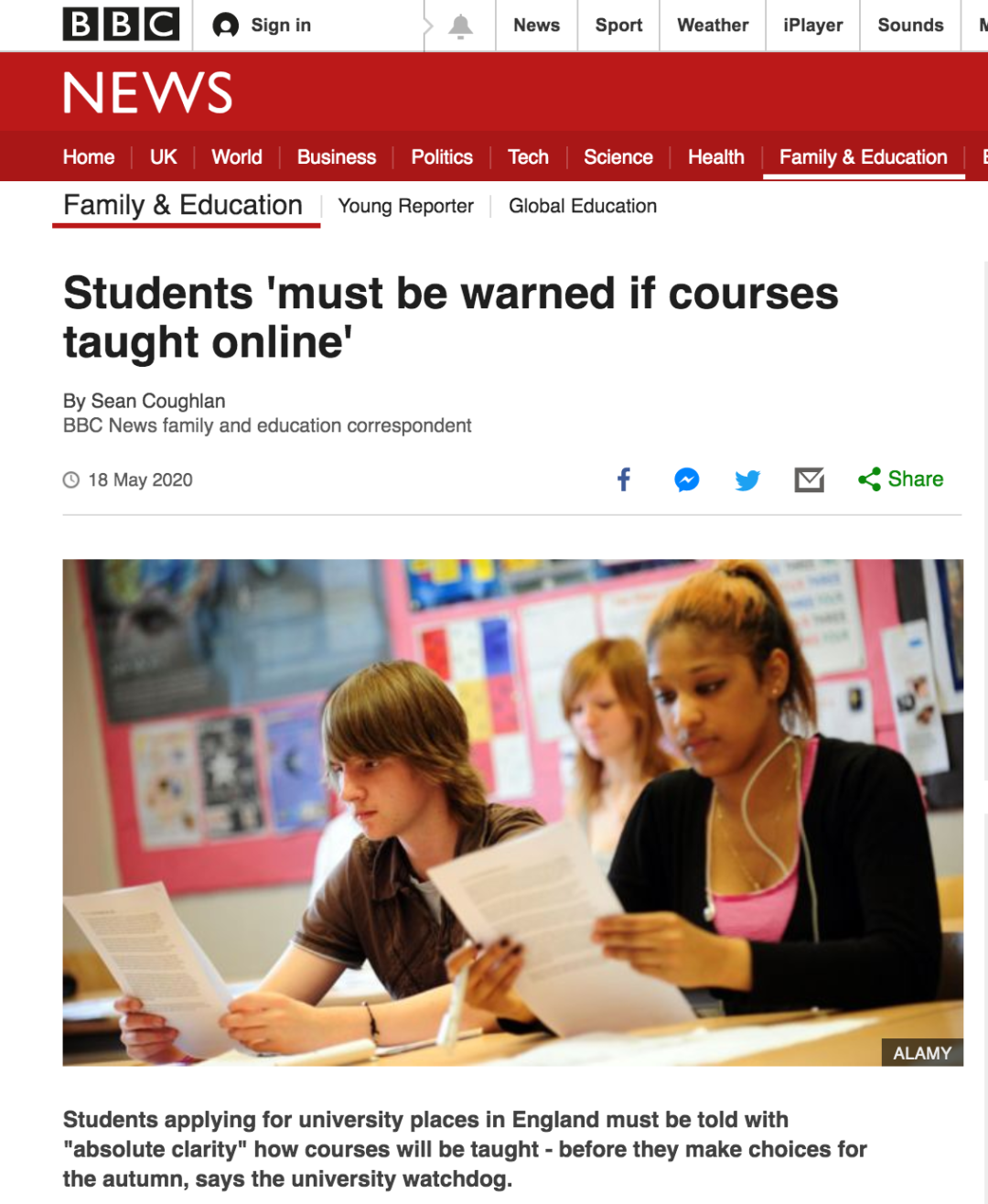 今日BBC也强调了,因为大学不会因为网课而改变学费金额,所以大学必须给同学们(新生以及老生)清晰地说明9月或者10月的授课方式。相信几周后,大学就会给出清楚地方案了,但是大概率是混合教学模式(大课会网络进行,小课估计依旧会选择面授)。