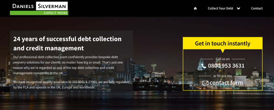 这个公司可了不起了,号称成功催债24年! 并且获得了 ISO 9001 & 27001的质量保证。他们遵守了 FCA的法规,业务范围是 英国、欧洲乃至全世界!