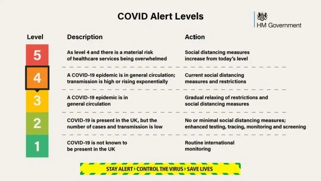 英国政府将新冠肺炎疫情警报级别从四级降到三级。在三级以下,该病毒被认为是“普遍传播”的,可能会“逐步放宽限制”。