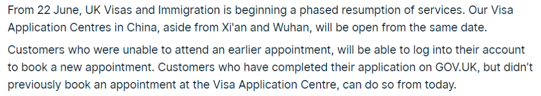 之前已经在GOV.UK上已经完成申请,但是由于疫情没能顺利预约或预约后无法抵达签证中心的朋友可以从6月9日起进行新的预约。