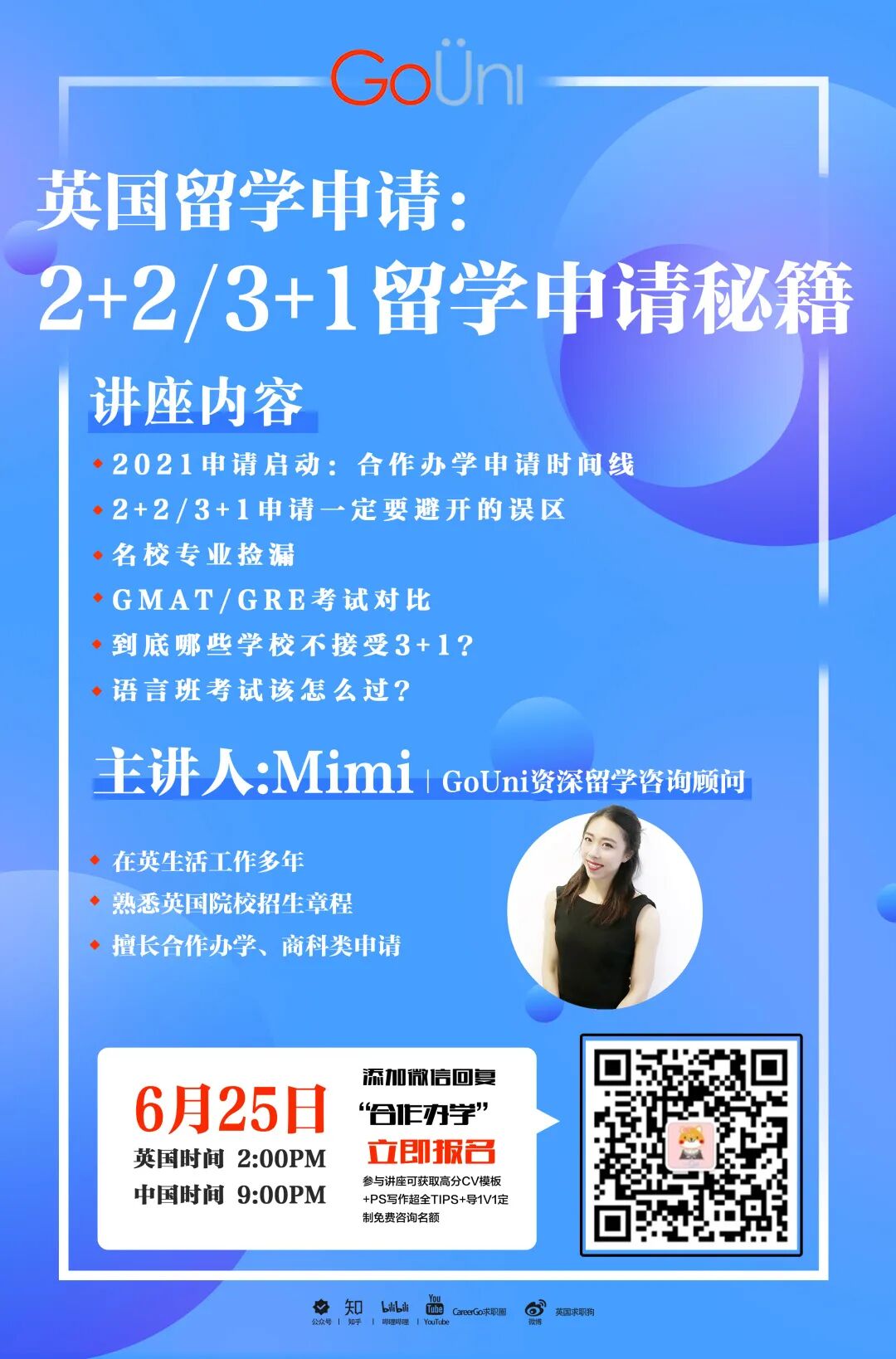收藏首先,明确的告诉3+1、2+2的同学,你们在申请英国研究生时是很有优势的。不过,时间越早越好。毕竟想要拿到到心仪的offer,至少需要提前一年做准备。
