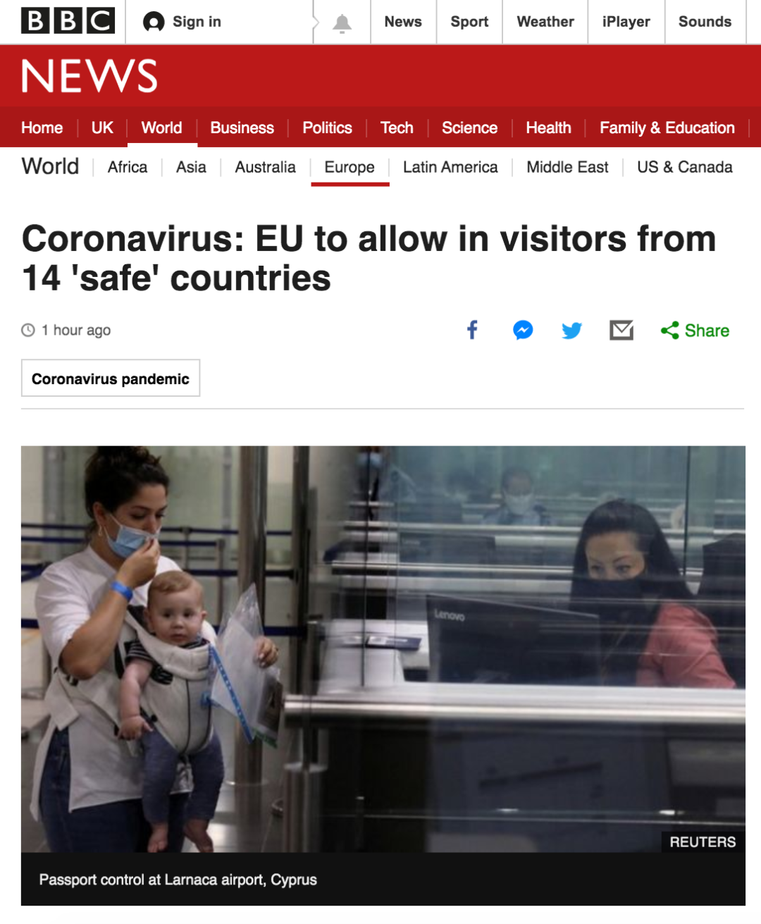 7月1日起,欧盟国家允许14个“安全”国家进入,但不包含中国!