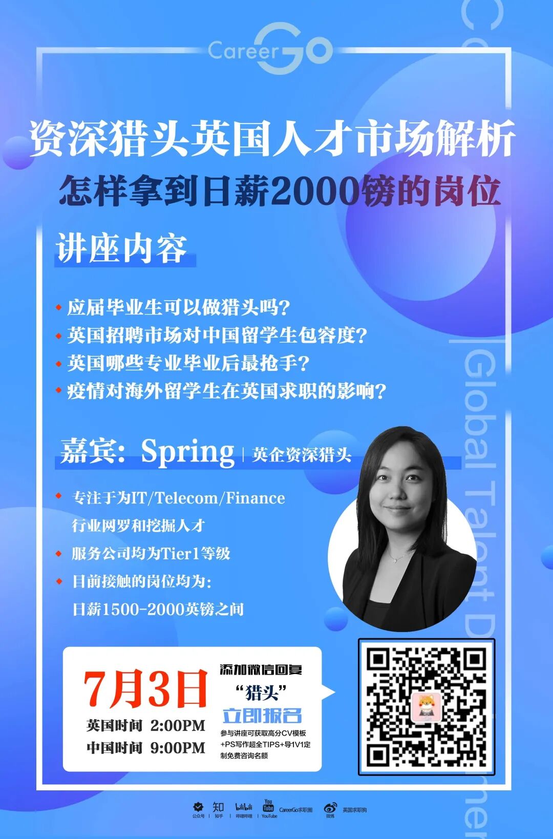 当然,还有一个靠谱且高效率的途径,那就是CareerGo为大家提供的资源!7月3日本周五,英国资深猎头做客CareerGo直播间,悄悄告诉你如何日进2000镑!