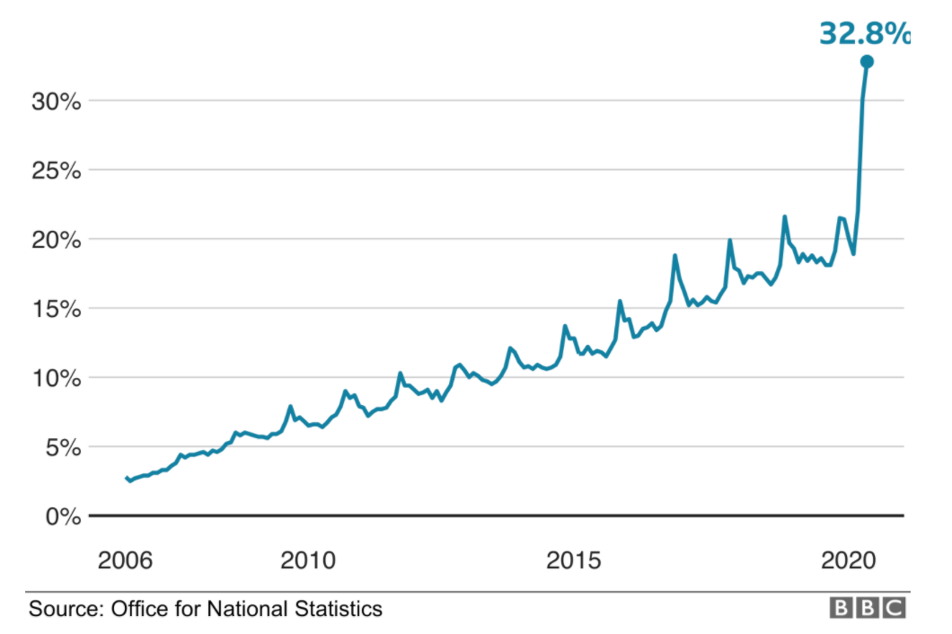 根据数据显示,Online Spend(在线支付)在2020年达到了巅峰,高达32.8%