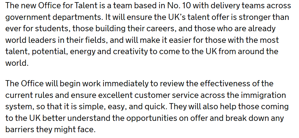 同时,唐宁街将成立一个新的部门,称为“人才办公室(office for talent)”。人才办公室(office for talent)的设置将更容易吸引全球领先的科学家、研究人员和创新者到英国工作生活。