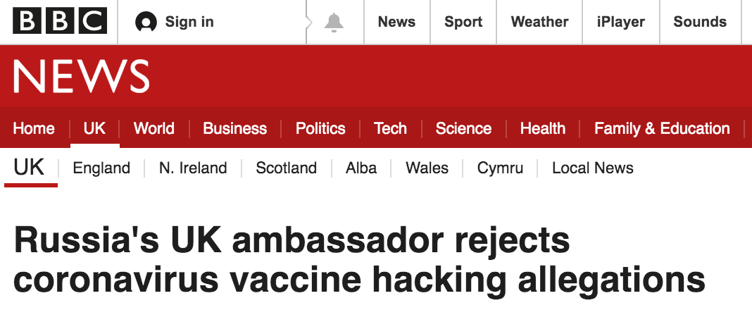 - 俄罗斯拒绝接受英国对他们的“盗取疫情情报”的指控