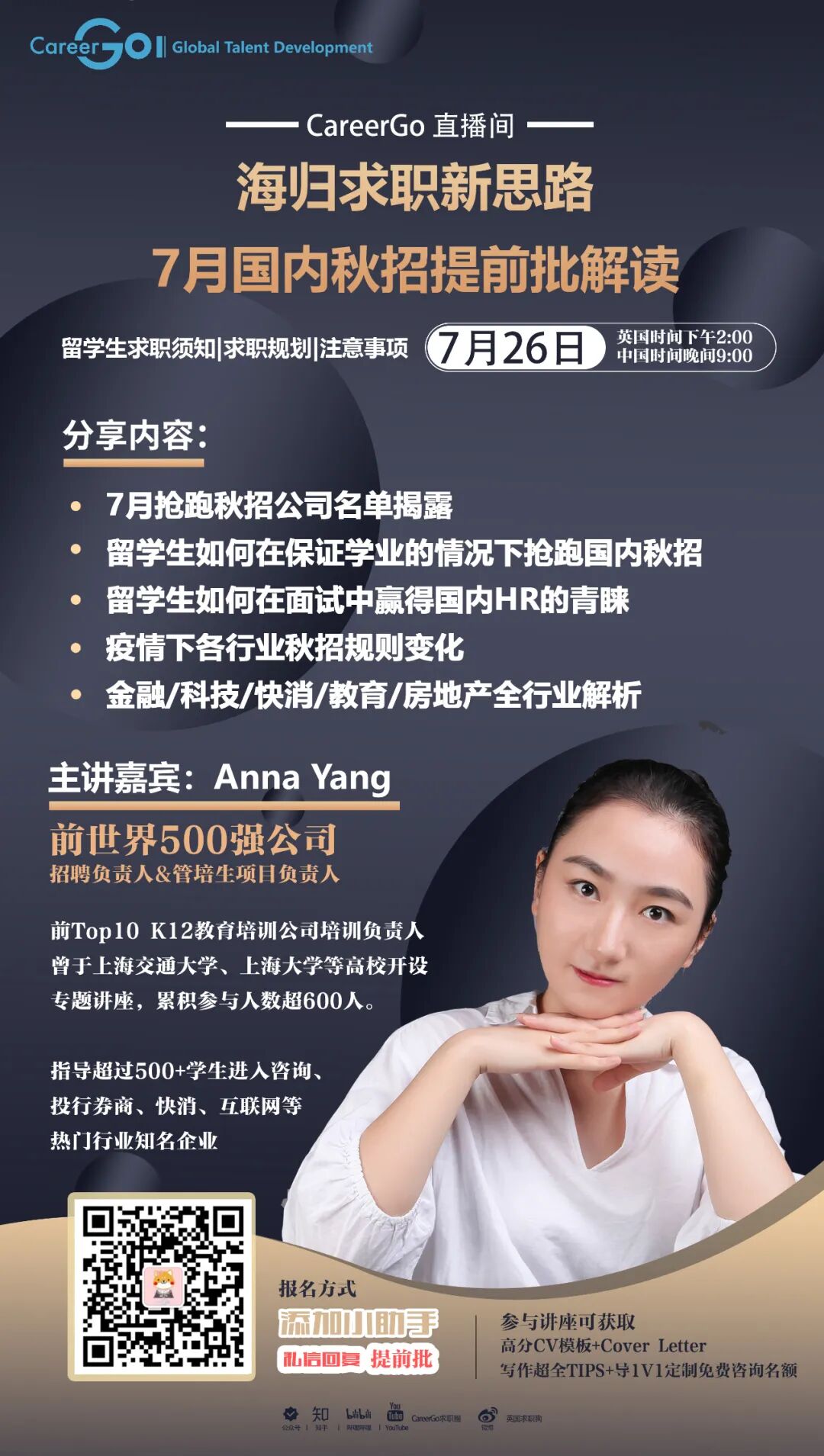 同学们还想了解哪些关于国内秋招的信息,更多关于秋招资讯,请关注7月26日CareerGo求职圈直播间,行业大咖带你寻找海归求职新思路!带你全方面突围国内秋招!
