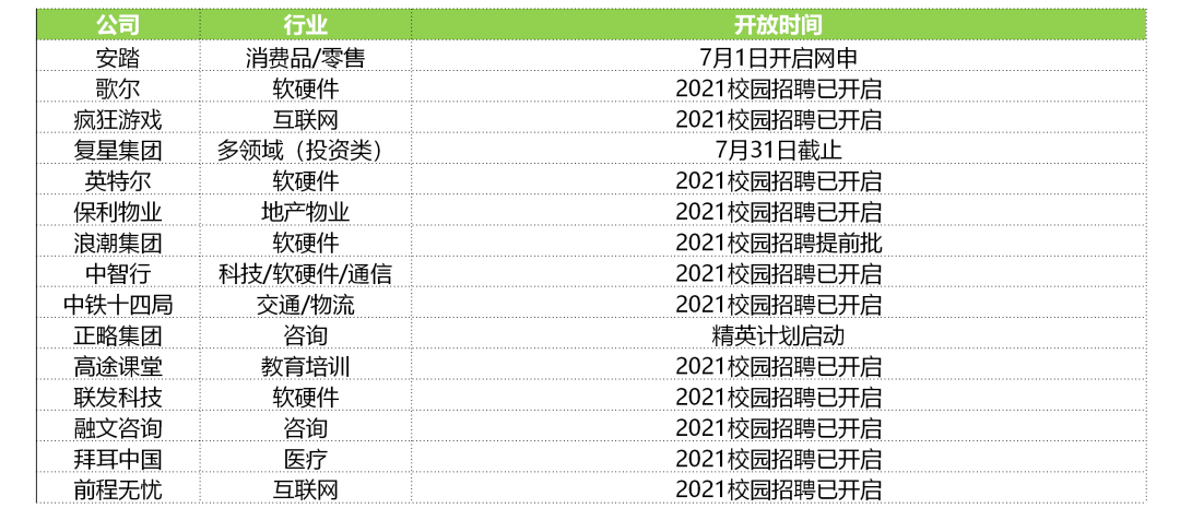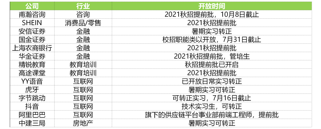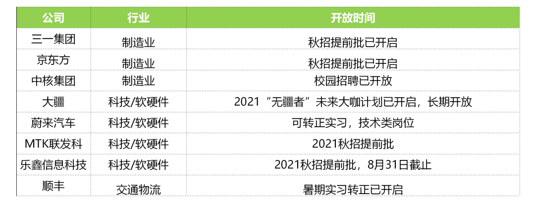 从6月底开始,各行业、各公司已经开启了秋招通道,小编给大家整理一些正在进行秋招的企业名单: