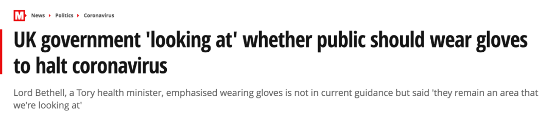 英国政府正在研究是否有必要在公共场合戴手套去防止病毒传播