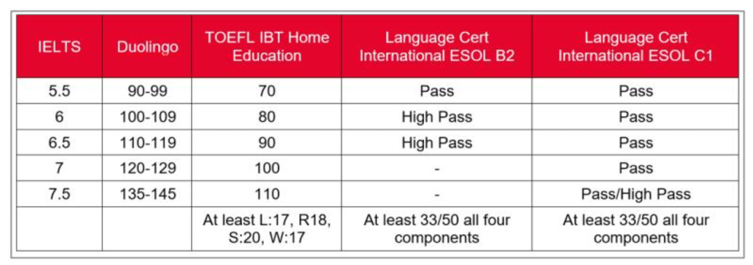 最低入学标准:SELT最低 5.5,且口语、听力和阅读成绩最低5.0 + 写作最低5.5