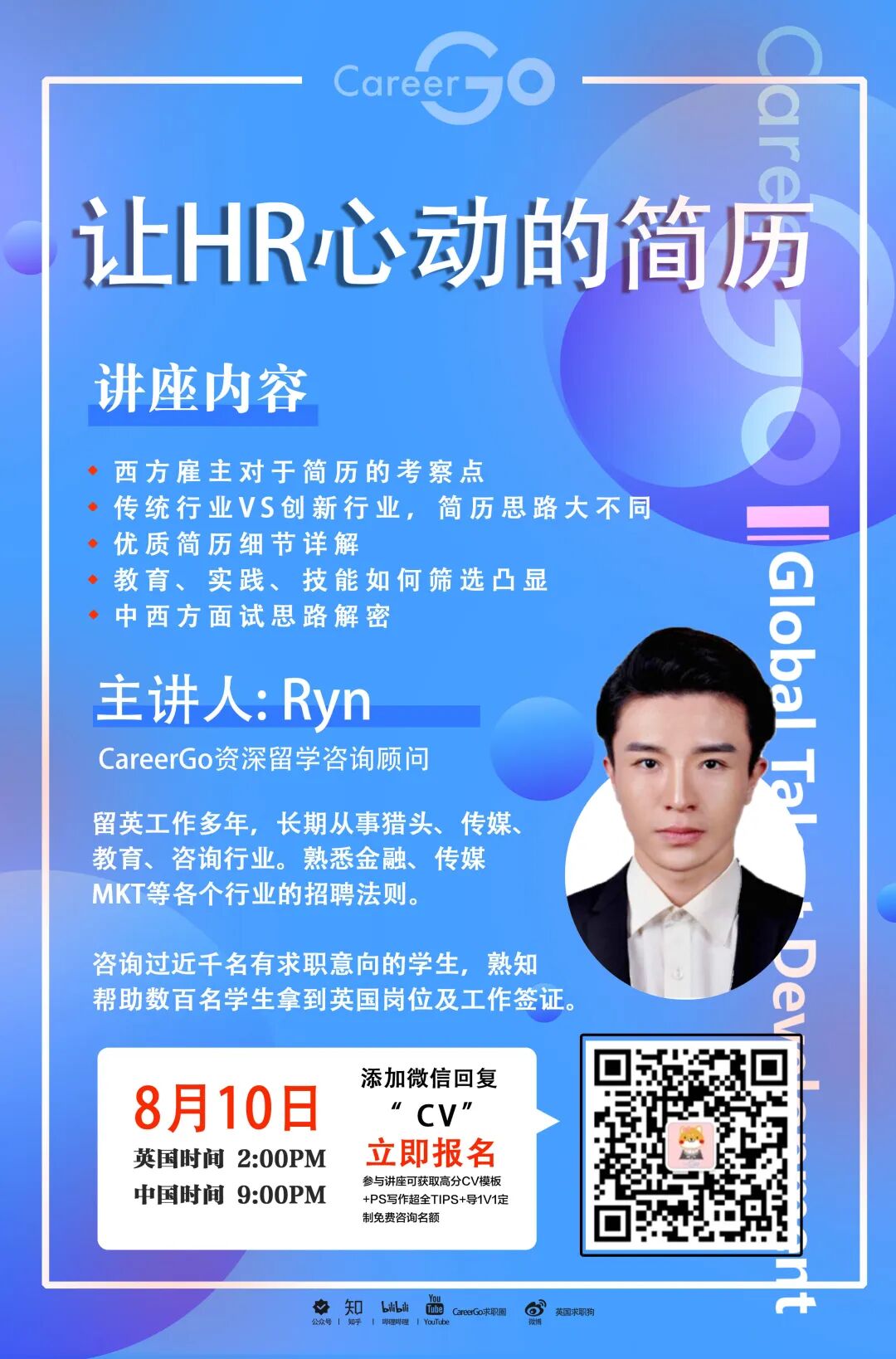 更多关于简历的考察点,8月10日,关注CareerGo直播间,更多的CV秘诀尽在直播中,Ryan老师为你揭晓!