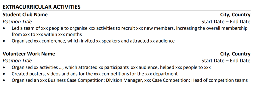 如果你参加了社团,那要说明自己在社团担任的职位、负责的工作、还有做了多久,获得/学到了什么。