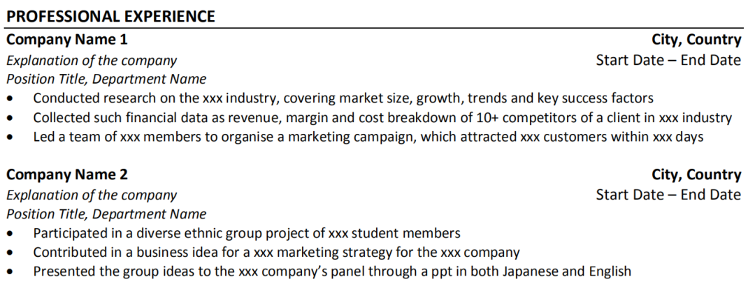 在这一部分中,同学们要把之前实习过的公司名称、所在城市、就职时间、职位名称以及工作内容写清楚。