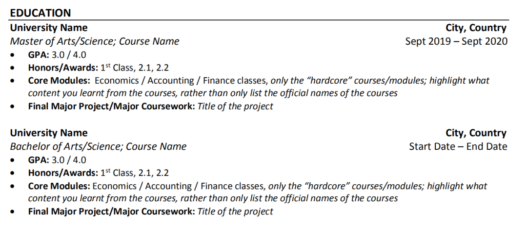 同学们在撰写教育背景时,一般只写最近的2个(本科和硕士),或者你可以选择写你认为有价值的1个,在这一部分,你要写清楚你所在的学校全称、专专业名称、上课时间、成绩绩点、具体学历、所学课程。