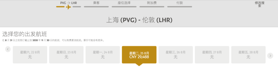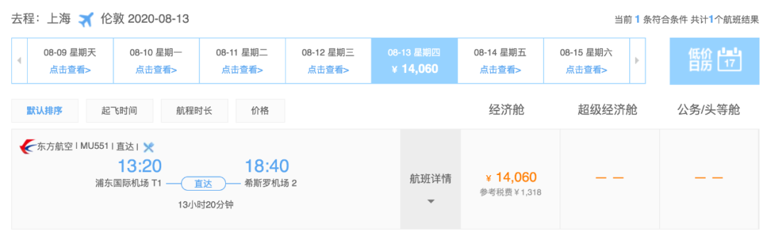 上海 ✈️ 伦敦 目前最早的航班是 8月4日 8月25日,每周都是固定的周2有票。