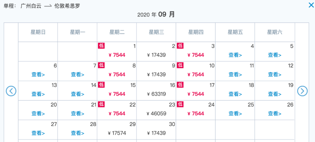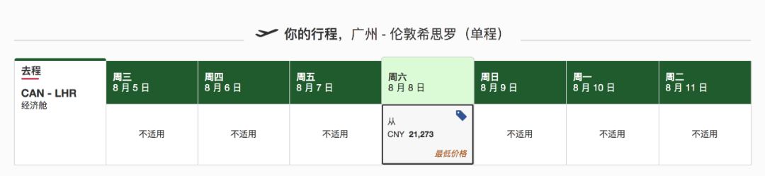 广州 ✈️ 伦敦 目前最早的航班是9月8日,每周都是固定的周6有票,迪拜转机。