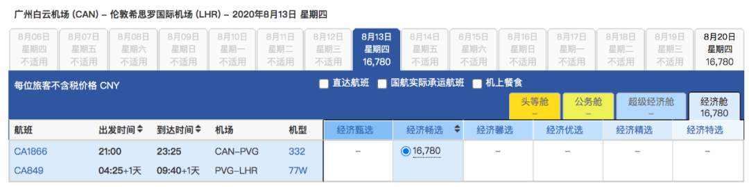 广州 ✈️ 伦敦 目前最早的航班是7月30日 8月13日,每周都是固定的周4有票。所有广州