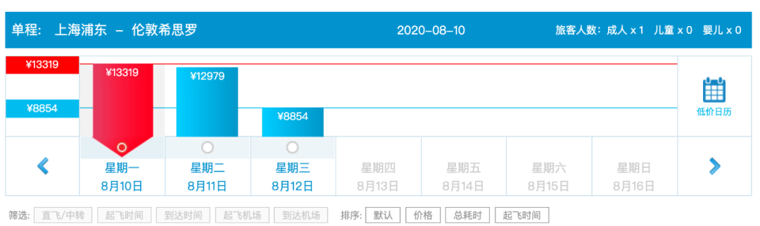 上海 ✈️ 伦敦 目前最早的航班是8月10日9月28日,每周都是固定的周1有票。