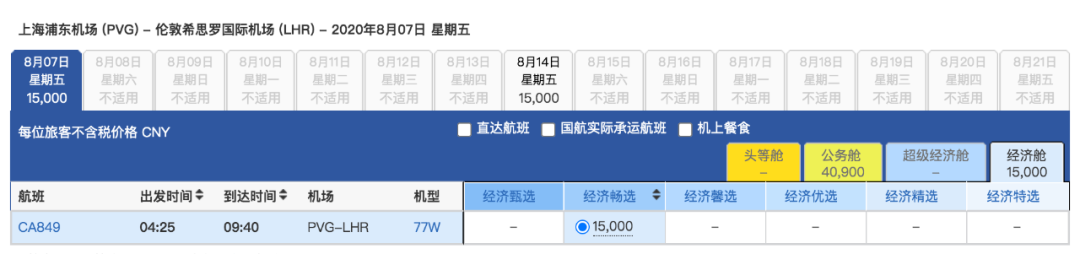 上海 ✈️ 伦敦 目前最早的航班是7月31日8月7日,每周都是固定的周5有票。到10月的价格都是固定的以下方案: