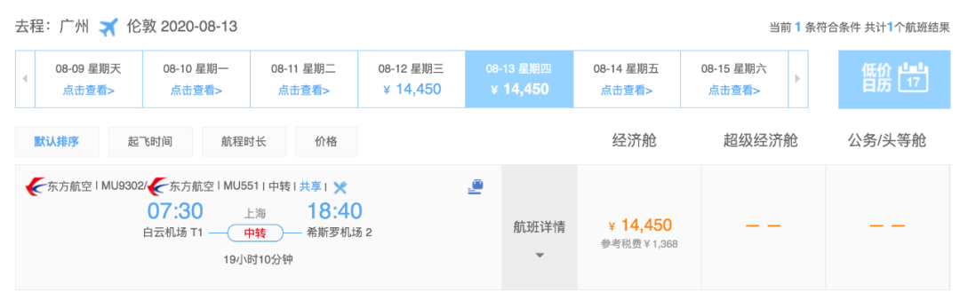 上海 ✈️ 伦敦 目前最早的航班是8月10日,每周都是固定的周1/2/3有票。但是都是从广州飞,所以最终起飞路线是:周一(荷兰转机)、周二广州直飞、周三(荷兰转机)。