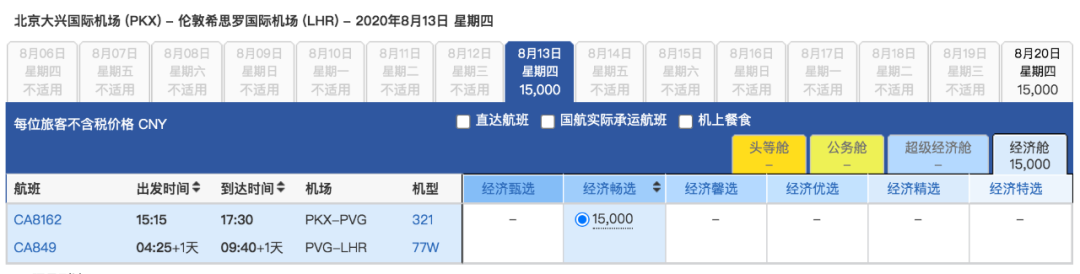 北京 ✈️ 伦敦 目前最早的航班是7月30日 8月13日,每周都是固定的周4有票。所有北京