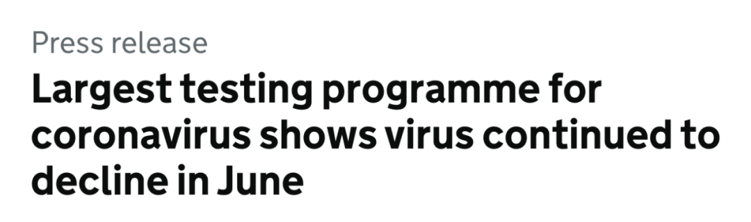 (新闻源:https://www.gov.uk/government/news/largest-testing-programme-for-coronavirus-shows-virus-continued-to-decline-in-june)