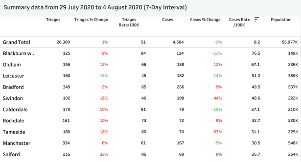 英国重点关注的10个疫情感染潜在爆发地,其中有5个城市数据上涨明显。莱斯特与曼城处于好转的状态。