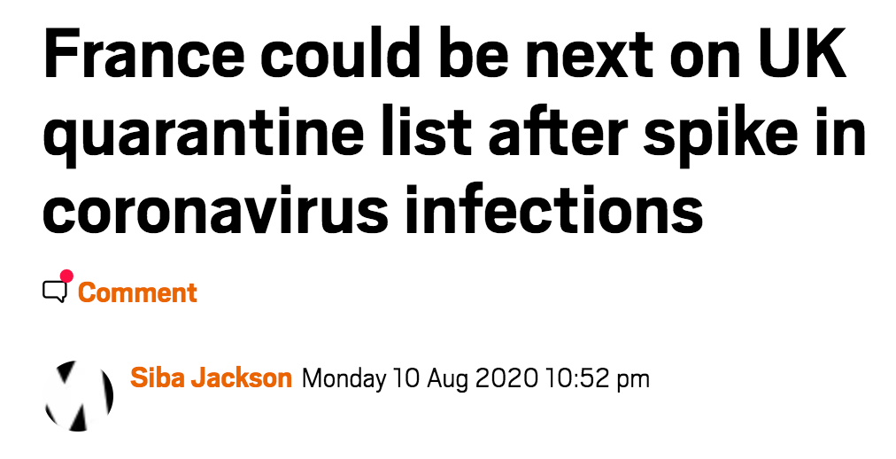 (新闻源:https://metro.co.uk/2020/08/10/fears-growing-france-next-uk-quarantine-list-spike-coronavirus-infections-13109564/)