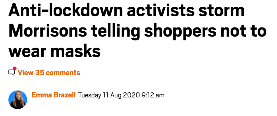 (新闻源:https://metro.co.uk/2020/08/11/anti-lockdown-activists-storm-morrisons-telling-shoppers-not-wear-masks-13111997/)