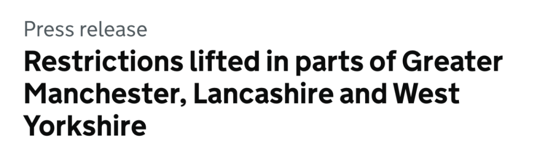 (新闻源:https://www.gov.uk/government/news/restrictions-lifted-in-parts-of-greater-manchester-lancashire-and-west-yorkshire)
