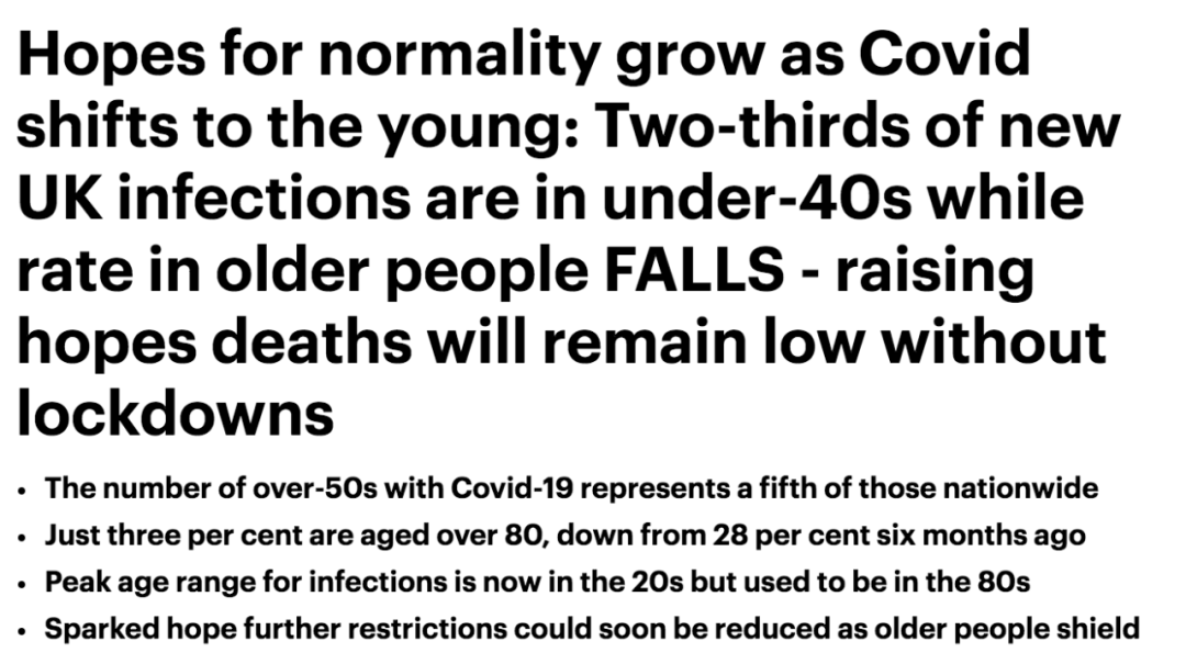(新闻源:https://www.dailymail.co.uk/news/article-8700399/Covid-shifts-young-Two-thirds-new-infections-UK-40s.html)
