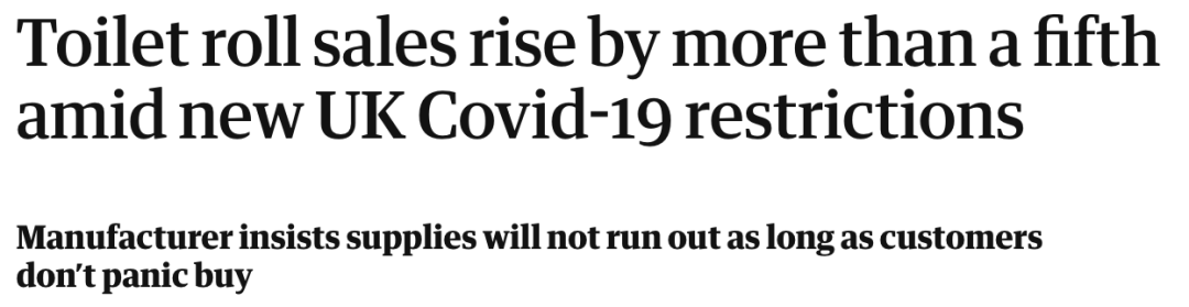 (新闻源:https://www.theguardian.com/world/2020/sep/22/toilet-roll-sales-rise-by-more-than-a-fifth-amid-new-uk-covid-19-restrictions)