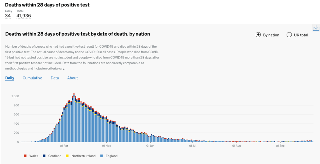 较昨日新增死亡人数:34人(没有包含苏格兰)