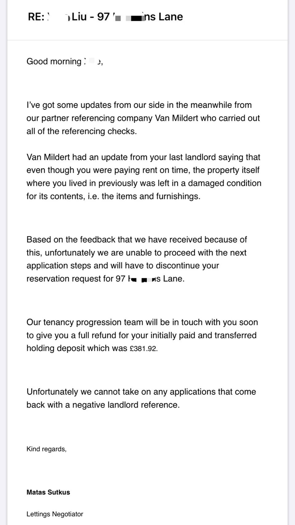 以下就是一个真实案例,就在早几天,一个Bristol 的同学就问了君君,这个是真的会被拒吗?外国人有钱都不赚的吗?君君想说, 这就是为什么外国人很看重Reference了,不好的反馈都会影响你租房的。