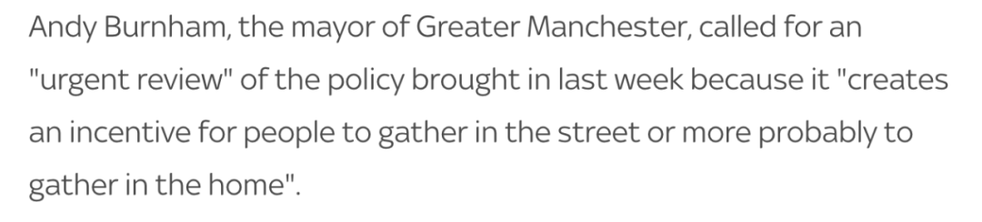 曼城的市长anDY Burnham说:“10点后的禁宵规定更容易刺激大家在街上聚会或者家里聚会”