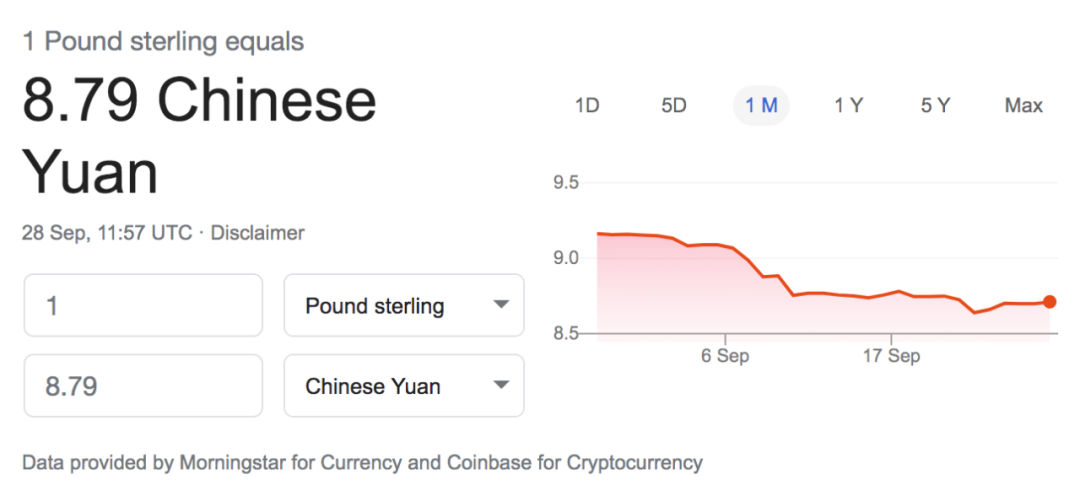 今日英镑兑人民币汇率:1:8.79 (+0.09)