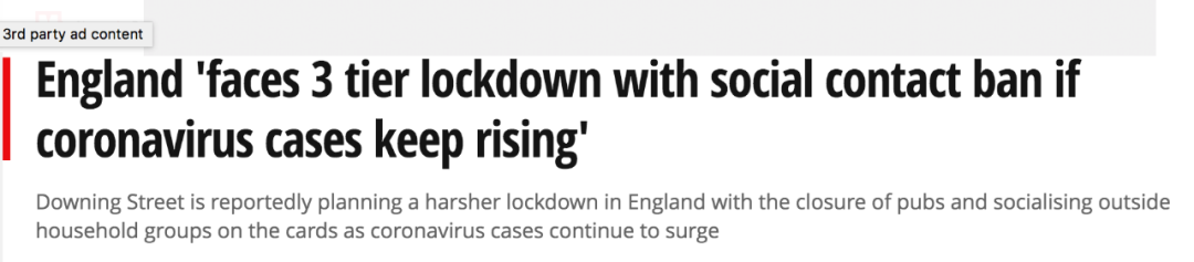 据报道,如果疫情没有得到控制,英格兰采取第三层封锁政策,将更严格的限制 本地或全国范围内酒吧的运营和禁止家庭外的社交接触,以应对不断上升的感染人数,现在的感染率已高于第一波高峰。