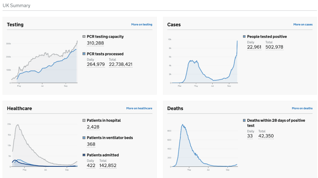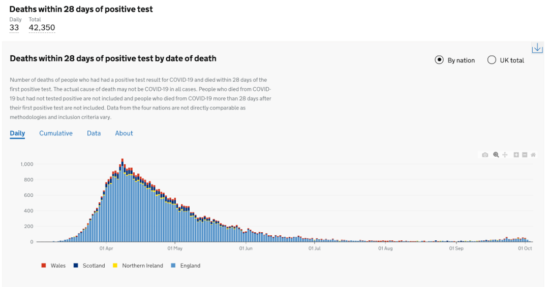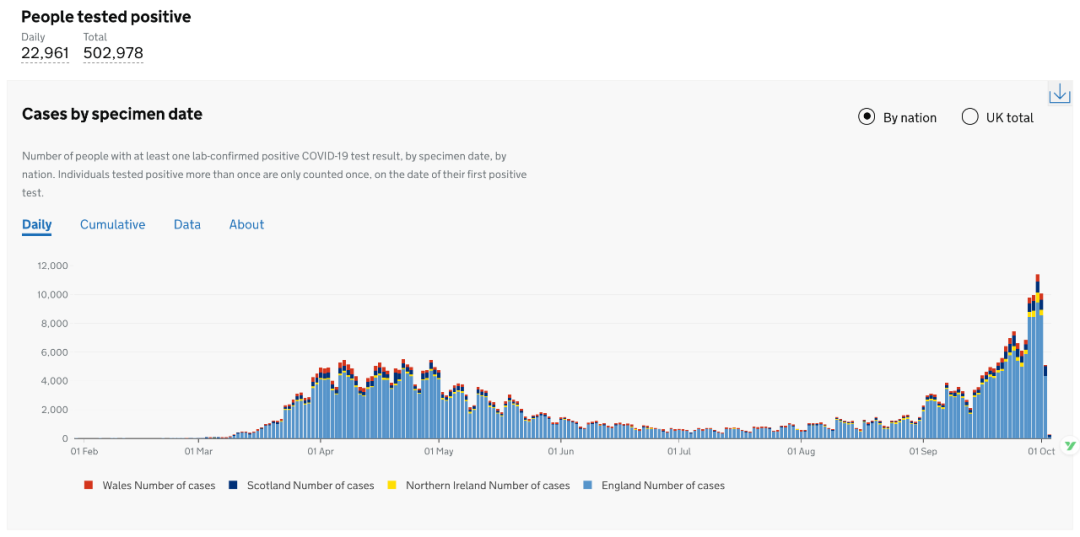 特别注意:GOV.UK 10月2日星期五,在自动流程中发现了一个问题。现在已经解决。 截止日期为10月3日至4日的确诊还包括15841人(9月25日至10月2日的确诊),因此,目前看到的这两天的1万多与2万多的确诊是虚高的。