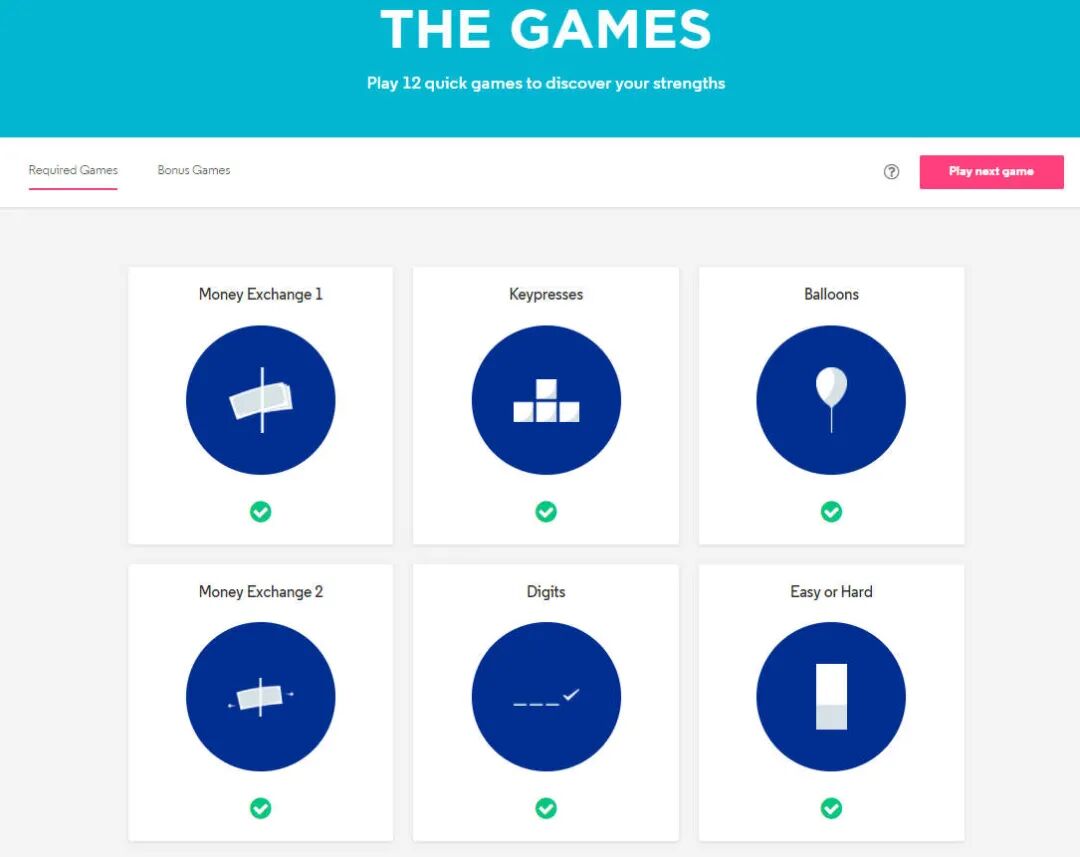 Pymetrics是一系列基于行为的神经科学游戏,可以客观地衡量认知、社交和行为属性。Pymetrics利用先进的技术来帮助摩根大通(JPMorgan Chase)筛选优质履历,更好的了解求职者的最本质的优势,从而帮助你找到最适合你的岗位。