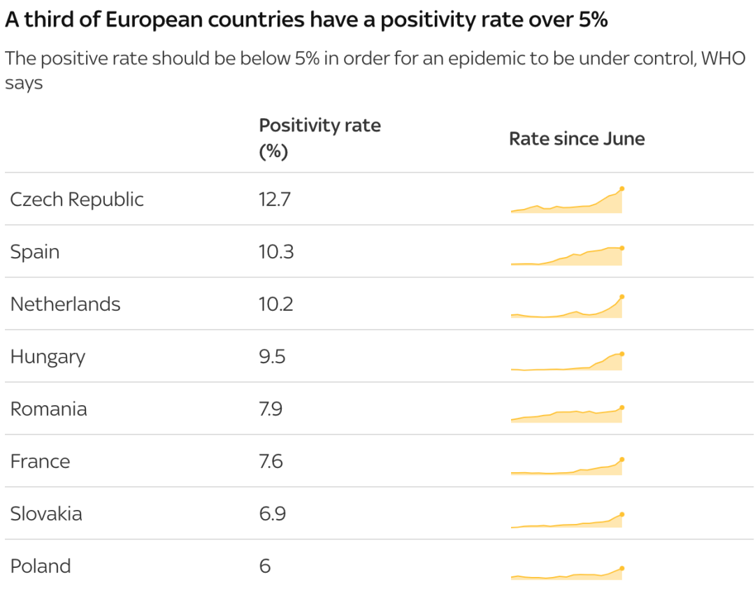 1/3的欧洲国家新冠感染率超过5% ,世卫组织表示,要想控制住新冠,感染率必须低于5%