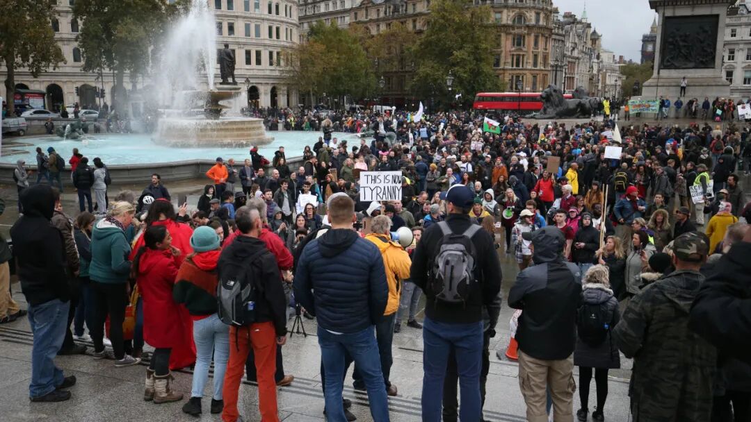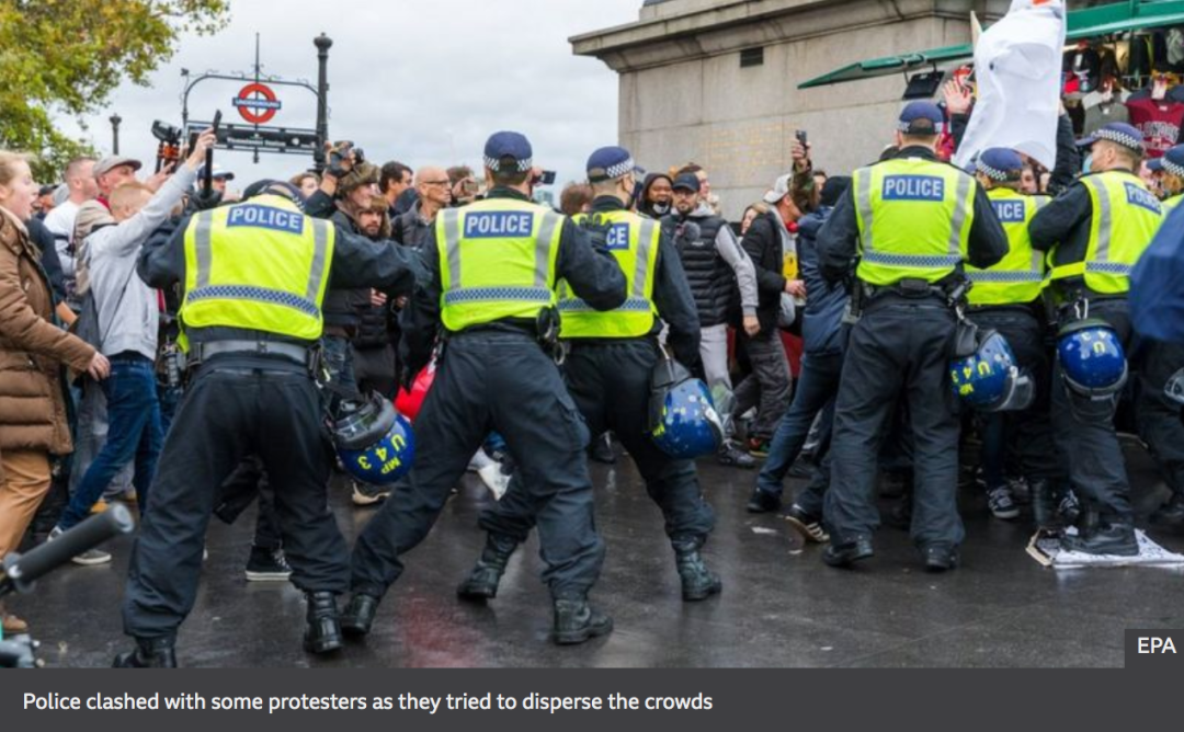 伦敦市中心举行的抗议活动中,18人被捕。大批民众聚集在白金汉宫外,然后前往特拉法加广场。一些抗议者举着标牌,呼吁“自由”和结束Covid-19限制的“暴政”。