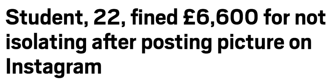 (新闻源:https://metro.co.uk/2020/10/27/student-22-fined-6600-for-not-isolating-after-posting-picture-on-instagram-13485306/)