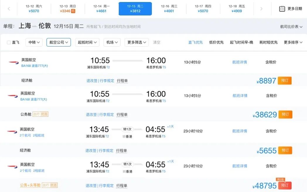 如果是12月中旬英国航空上海飞伦敦,一般有两班选择,包括直飞以及香港转机。