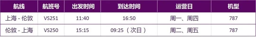 其中上海-伦敦的航班于每周一、四执飞;伦敦-上海的航班于每周二、五执飞。