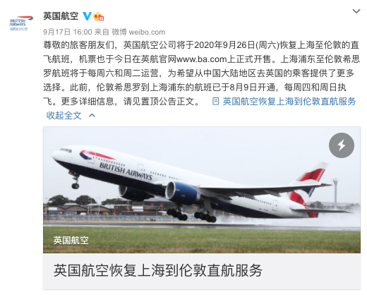 据英国航空公司的官微信息,目前已经恢复上海-伦敦的执飞航班。