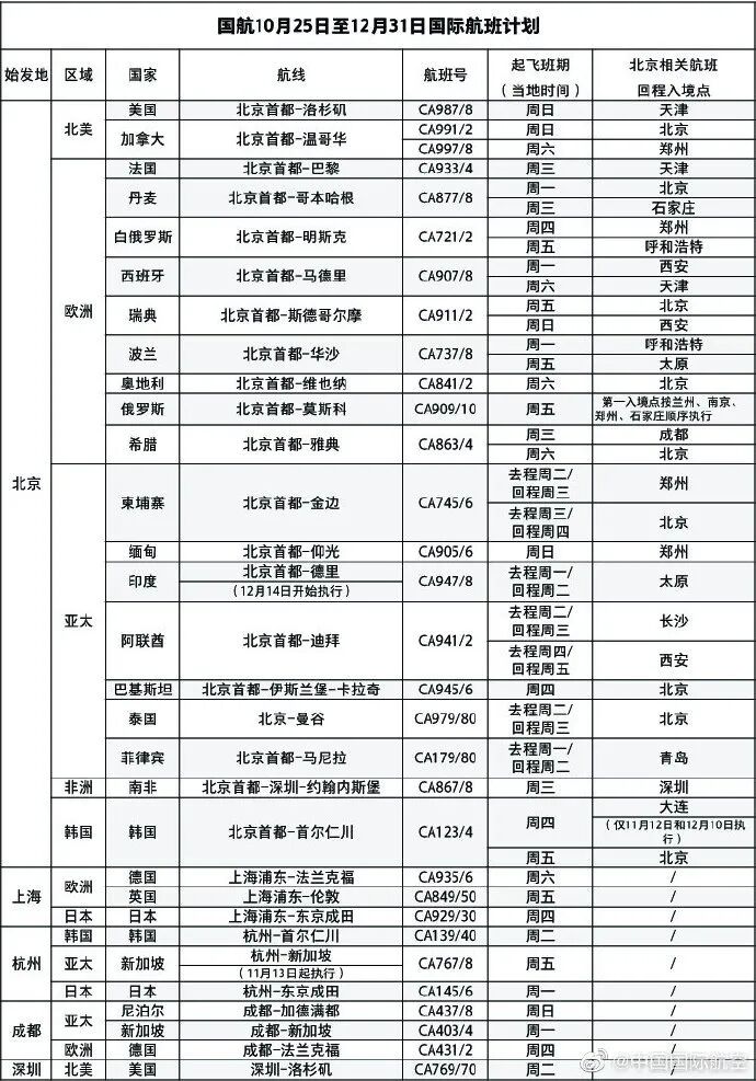 自2020年10月25日至12月31日24时,国航每周可执行国际航线共计30条。