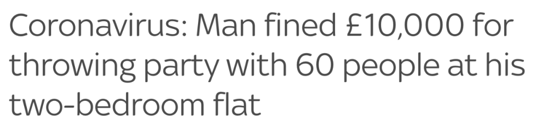 (新闻源:https://news.sky.com/story/coronavirus-man-fined-10-000-for-throwing-party-with-60-people-at-his-two-bedroom-flat-12126430)